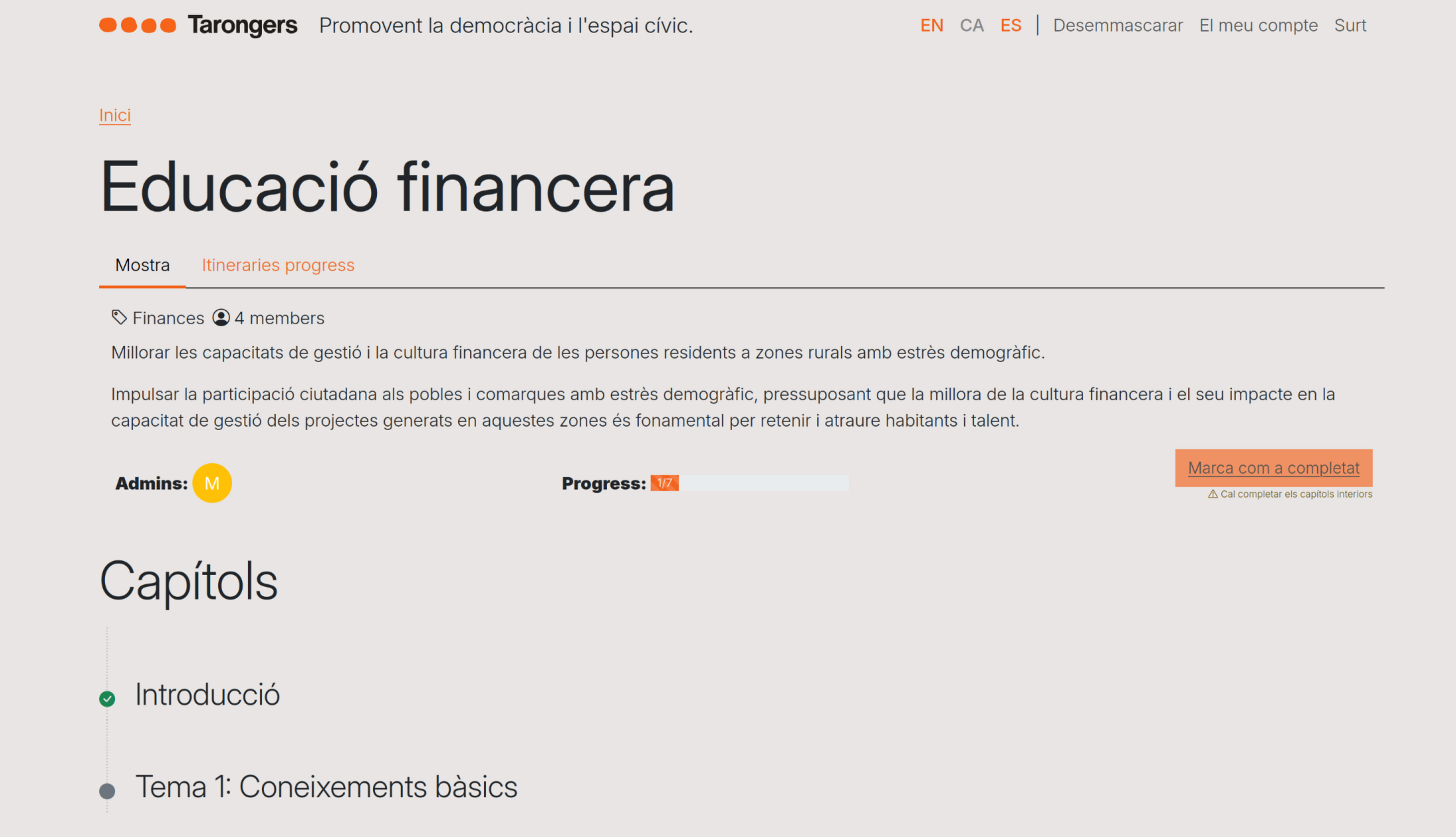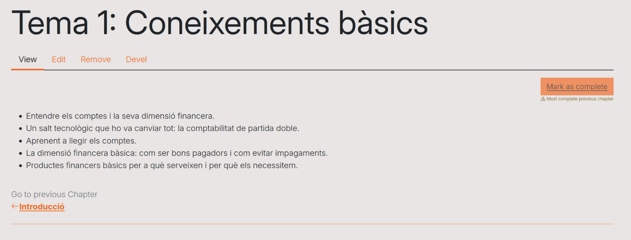 Una vegada completats tots els recursos del capítol, marcarem el capítol com a completat i podrem continuar amb el següent.