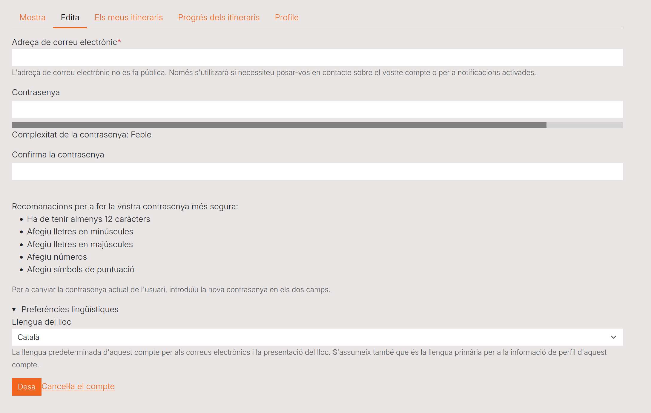 Seràs redirigit a un formulari on podràs establir la teva contrasenya en l’espai web. Aquesta contrasenya serà la que utilitzaràs per accedir a la plataforma durant el procés de l'itinerari.