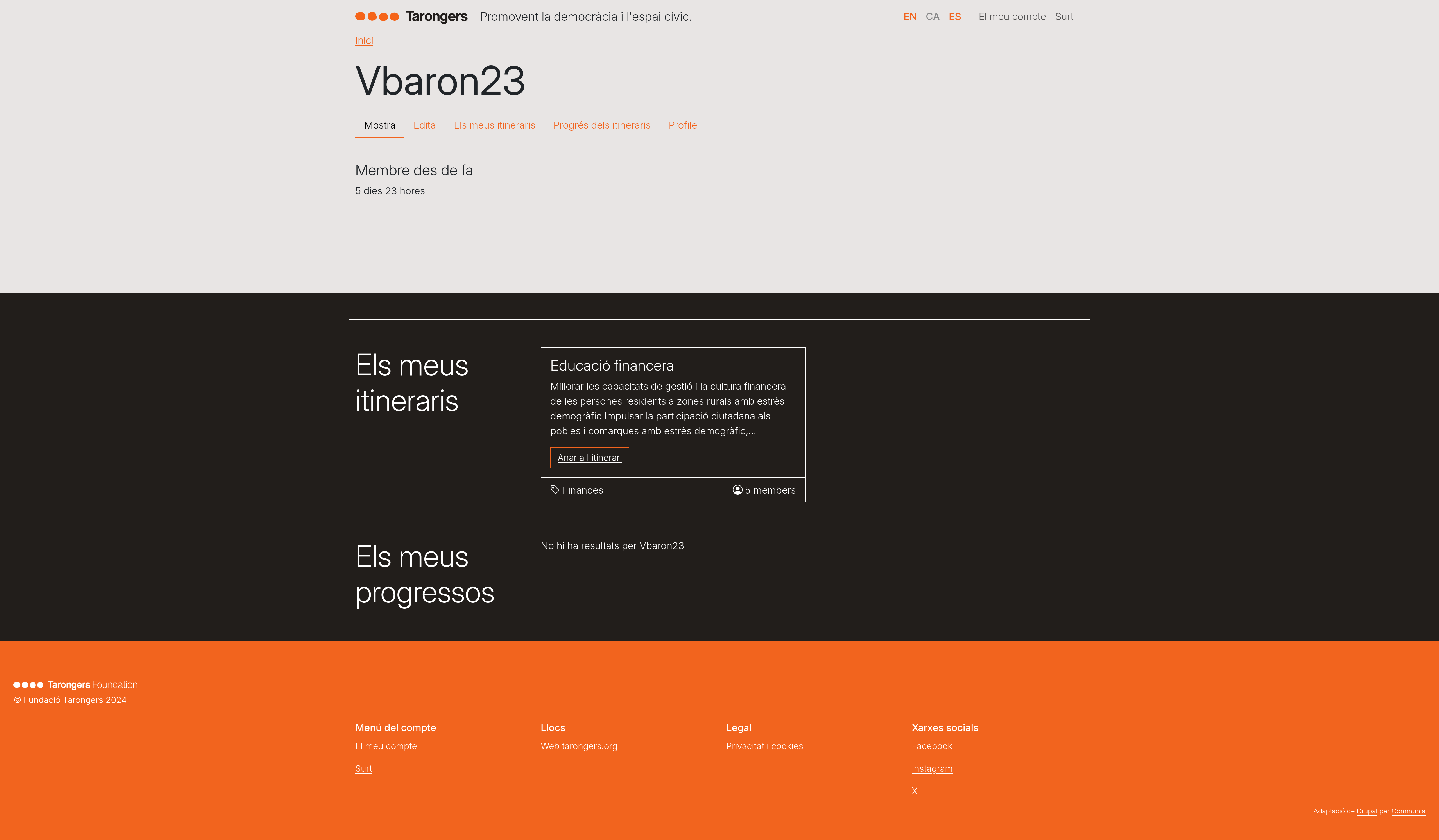 Un cop hagis iniciat sessió podràs accedir a la pàgina principal de l’usuari, on trobaràs un resum dels teus itineraris i els seus progressos associats, a més de les opcions per gestionar el teu perfil. Per veure la informació més ampliada pots navegar a través de les pestanyes del menú que trobaràs a sota del teu nom d’usuari.